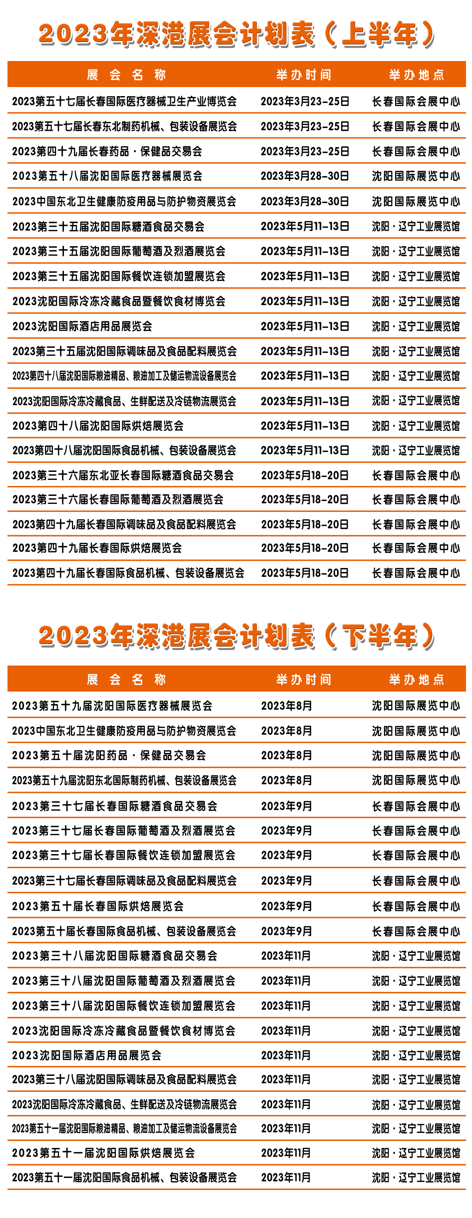 2023 the 57th Changchun International Medical Equipment and Health Industry Fair March 23-25, 2023 Changchun International Conference and Exhibition Center 2023 the 58th Shenyang International Medical Equipment Fair March 28-30, 2023 Shenyang International Exhibition Center 2023 the 35th Shenyang International Food &Drinks Fair May 11-13, 2023 Liaoning Industrial Exhibition Hall 2023 the 36th Northeast Asia Changchun International Food &Drinks Fair May 18-20, 2023 Changchun International Conference and Exhibition Center 2023 the 59th Shenyang International Medical Equipment Fair August 10-12, 2023 Shenyang International Exhibition Center 2023 the 37th Northeast Asia Changchun International Food &Drinks Fair September 2023 Changchun International Conference and Exhibition Center 2023 the 38th Shenyang International Food &Drinks Fair November 2023 Liaoning Industrial Exhibition Hall |