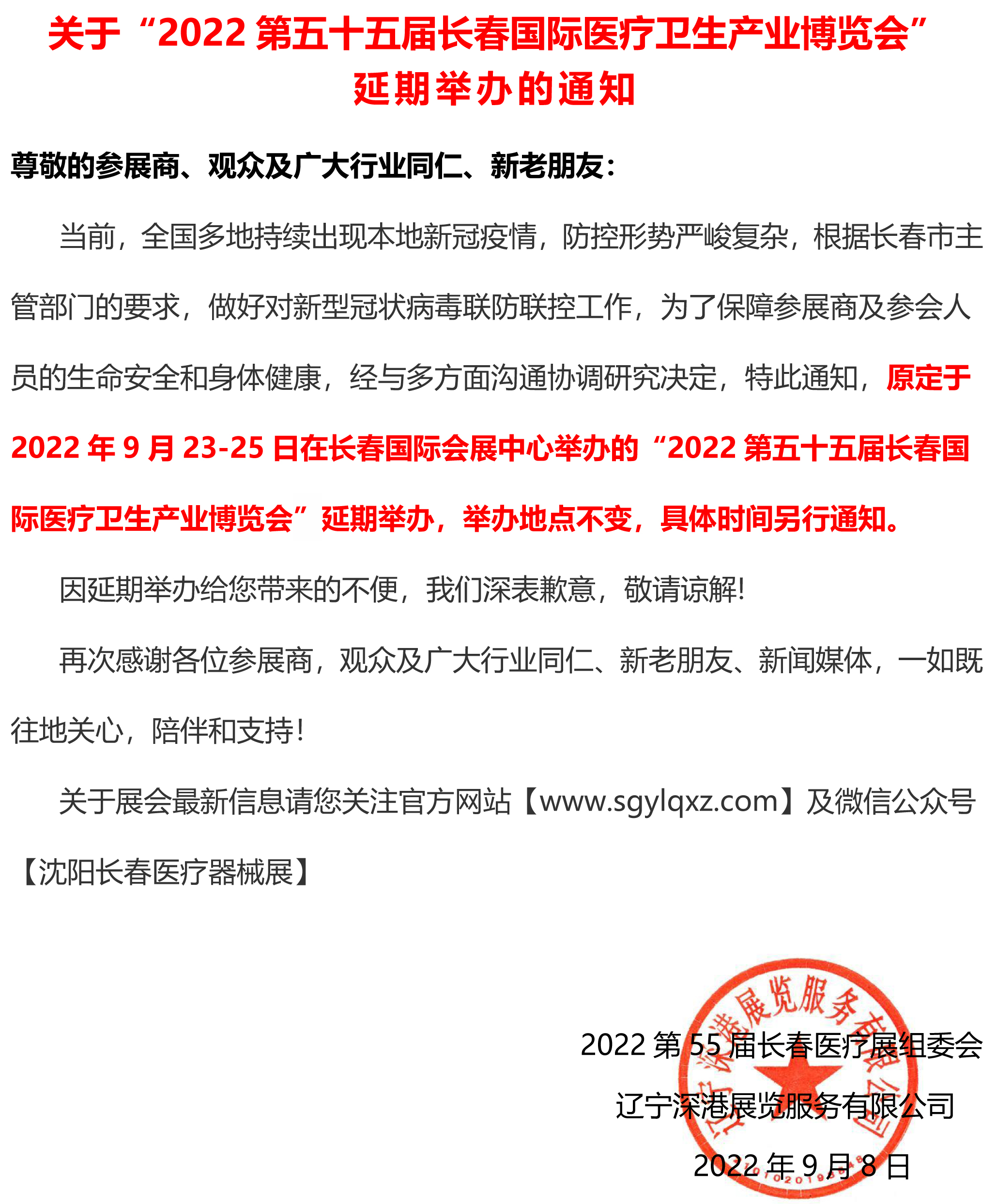 | 關(guān)于“2022第五十五屆長(zhǎng)春國(guó)際醫(yī)療衛(wèi)生產(chǎn)業(yè)博覽會(huì)”延期舉辦的通知 | |